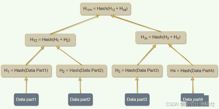 Merkle树是哈希的二叉树,其中每个内部节点是其两个子节点的哈希,每个叶节点是原始数据一部分的哈希。