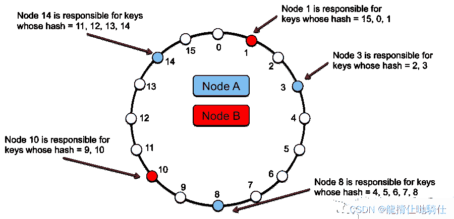 通过对数据项的键进行哈希处理以产生其在环上的位置,然后顺时针遍历环以查找位置大于该项位置的第一个节点,将每个由键标识的数据项分配给节点。与节点关联的节点是数据项的位置。