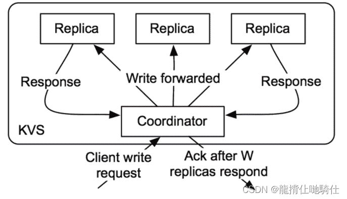 Dynamo 将写入复制到系统中其他节点的草率quorum,而不是像Paxos那样的严格多数quorum。所有读/写操作都在首选项列表中的第一个NN正常节点上执行,该节点可能并不总是在遍历一致哈希环时遇到的第一个NN节点。