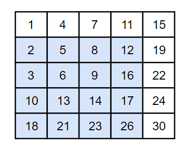 当前元素的查找区间为左下角的所有元素,例如元素 12 的查找区间如下: