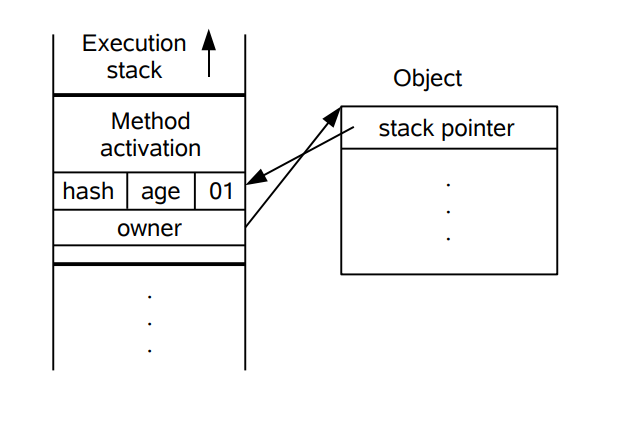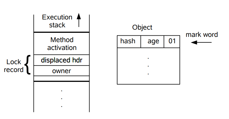 下图左侧是一个线程的虚拟机栈,其中有一部分称为 Lock Record 的区域,这是在轻量级锁运行过程创建的,用于存放锁对象的 Mark Word。而右侧就是一个锁对象,包含了 Mark Word 和其它信息。