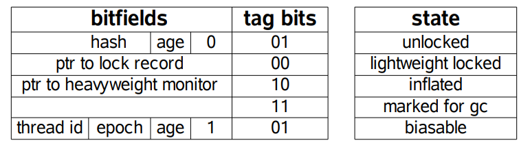以下是 HotSpot 虚拟机对象头的内存布局,这些数据被称为 Mark Word。其中 tag bits 对应了五个状态,这些状态在右侧的 state 表格中给出。除了 marked for gc 状态,其它四个状态已经在前面介绍过了。