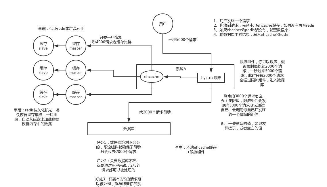 • 事中:本地ehcache缓存 + hystrix限流&降级,避免MySQL崩掉