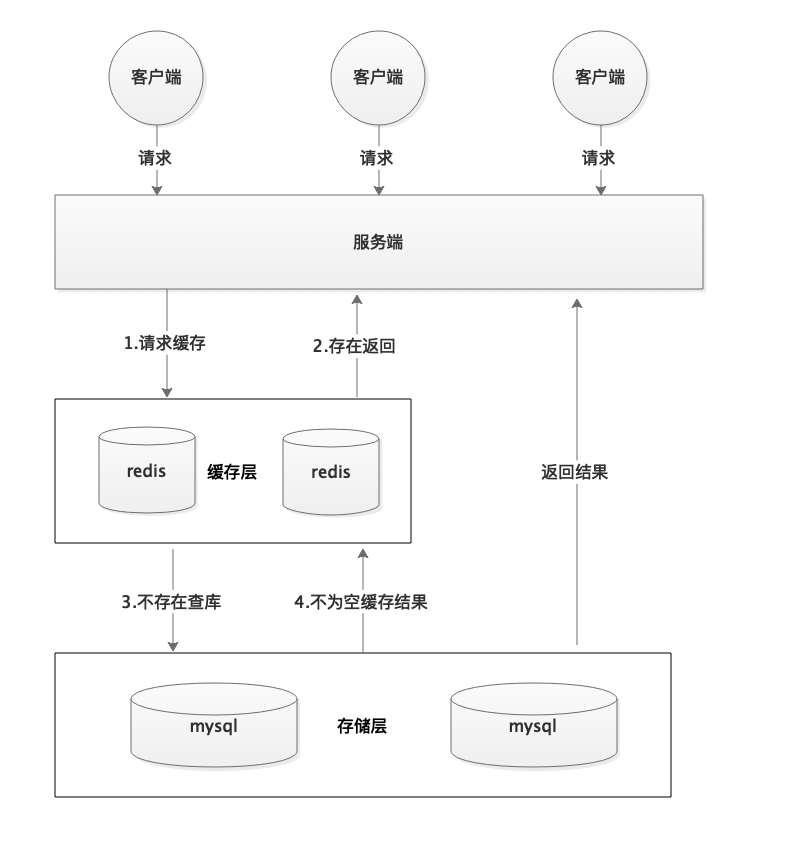 缓存穿透说简单点就是大量请求的 key 根本不存在于缓存中,导致请求直接到了数据库上,根本没有经过缓存这一层。举个例子:某个黑客故意制造我们缓存中不存在的 key 发起大量请求,导致大量请求落到数据库。下面用图片展示一下(这两张图片不是我画的,为了省事直接在网上找的,这里说明一下):
