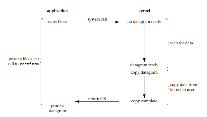 对于一个套接字上的输入操作,第一步通常涉及等待数据从网络中到达。当所等待分组到达时,它被复制到内核中的某个缓冲区。第二步就是把数据从内核缓冲区复制到应用进程缓冲区。