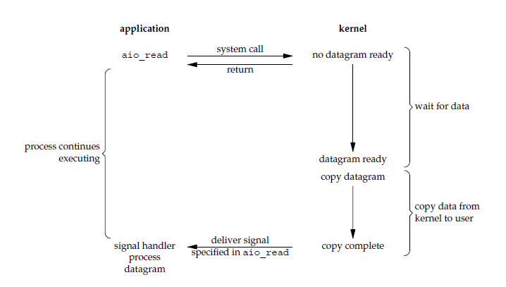 进行 aio_read 系统调用会立即返回,应用进程继续执行,不会被阻塞,内核会在所有操作完成之后向应用进程发送信号。